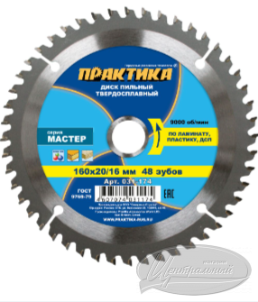 Пильные диски по ламинированным материалам, ДСП, пластику. ГОСТ 9769-79. Серия «Мастер». Высококачественные пильные диски для ручных дисковых пил и станков. Твердость тела HRC 45-46, напаек из карбида вольфрама (сплав ВК8) HRC. 90-93. Угол атаки зуба + 10°.