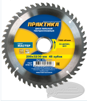 Пильные диски по дереву и ДСП. ГОСТ 9769-79. Серия «Мастер». Высококачественные пильные диски для ручных дисковых пил и станков. Твердость тела HRC 45-46, напаек из карбида вольфрама (сплав ВК8) HRC. 90-93. Угол атаки зуба + 15°.
