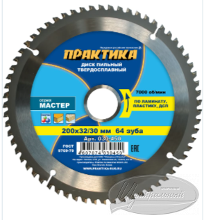Пильные диски по ламинированным материалам, ДСП, пластику. ГОСТ 9769-79. Серия «Мастер». Высококачественные пильные диски для ручных дисковых пил и станков. Твердость тела HRC 45-46, напаек из карбида вольфрама (сплав ВК8) HRC. 90-93. Угол атаки зуба + 10°.