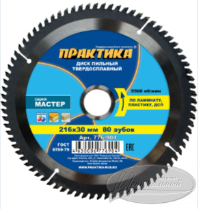 Пильные диски по ламинированным материалам, ДСП, пластику. ГОСТ 9769-79. Серия «Мастер». Высококачественные пильные диски для ручных дисковых пил и станков. Твердость тела HRC 45-46, напаек из карбида вольфрама (сплав ВК8) HRC. 90-93. Угол атаки зуба + 10°.