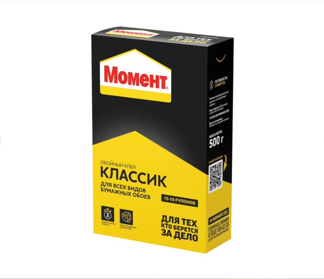 Клей для обоев МОМЕНТ классик 500 г 765166 предназначен для наклеивания всех видов бумажных обоев: гладких, структурных, гофрированных, дуплекс, тяжелых, а также виниловых и других специальных обоев. Высококачественный, быстрорастворимый обойный клей на основе модифицированного крахмала. Клей обеспечивает противогрибковую защиту.