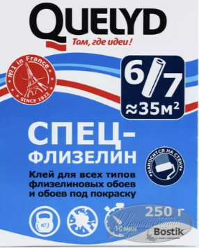 Клей д/обоев QUELYD СПЕЦ-Флизелин 250г — Специальный клей для любых обоев на нетканой флизелиновой основе, тяжёлых виниловых обоев на флизелиновой основе, в том числе и для флизелиновых обоев под покраску. Усиленная формула; Легкое нанесение клея позволяет быстро состыковать полотна; Незаменим при наклейки обоев со сложным рисунком; Экономит время: клей наносится прямо на стену, не нужно ждать, когда пропитаются обои; При окрашивании обоев не вступает в реакцию с краской; Легкое снятие обоев по истечении их срока службы, так как клей не оставляет следов; Безопасен для здоровья и окружающей среды. Вес — 250 грамм. Состав: модифицированный крахмал, противогрибковые добавки. Срок годности 10 лет.