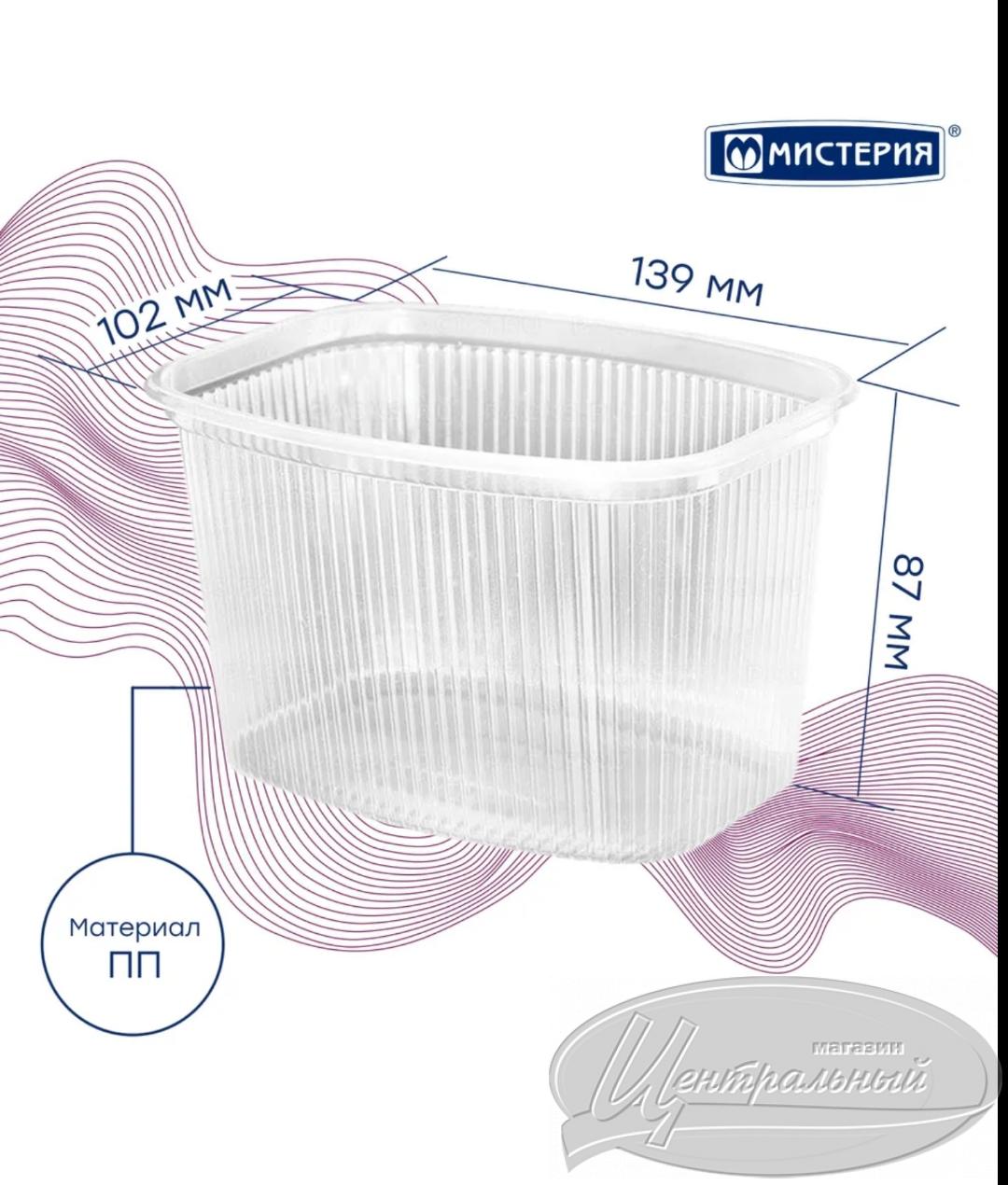 Контейнер односекционный Мистерия объемом 750 мл имеет размеры 139x102x87 мм. В комплекте с каждым контейнером идет крышка. Изготовлен из прозрачного полипропилена (ПП). В упаковке 5 штук.