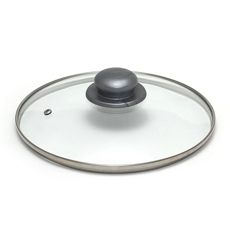 Стеклянная жаропрочная крышка С ПАРОВЫПУСКНЫМ КЛАПАНОМ, в ободе из нержавеющей стали и ручкой в упаковке.
