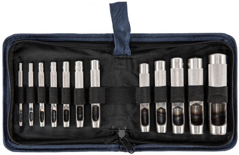 Набор пробойников для кожи Сибртех 18312, 12 шт. в чехле, позволяет пробивать отверстия диаметром 3, 4, 5, 6, 7, 8, 9, 10, 12, 14, 16 и 19 мм посредством ударного воздействия киянкой. Предназначен для работы с плотными материалами: кожей и резиной. Благодаря высокоточной прецизионной заточке режущих кромок пробойники выполняют ровный и качественный рез.ПреимуществаПробойники из инструментальной стали 45 отличаются прочностью и долговечностью.Рельефные рукоятки обеспечивают надежный хват и комфортную работу.Набор поставляется в жестком нейлоновом чехле на молнии для удобной транспортировки и хранения.