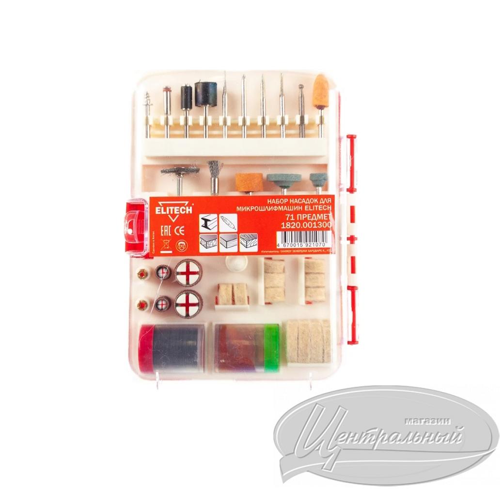 Набор оснастки (71 предмет) для гравировальных машин Elitech 1820.001300 включает в себя предметы для выполнения работ любой сложности. Содержит насадки разной формы и зернистости, предназначенные для резки, шлифовки и полировки древесины, металла, пластика и т.д. Поставляется в пластиковом кейсе.
