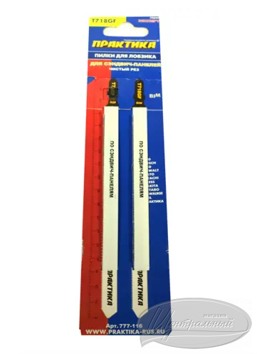 Набор Практика 777-116 серии «Эксперт» состоит из двух полотен типа T718GF, рассчитанных на точный, чистый распил сэндвич-панелей, а также листов из стали и других цветных металлов. Изготовлены из сверхпрочной высокоуглеродистой стали с волнистыми зубьями с шагом 1 мм. Удлиненная биметаллическая оснастка обеспечивает аккуратный результат и длительный срок службы. Они совместимы с электрическими лобзиками с креплением для T-образного хвостовика от всех ведущих мировых производителей.