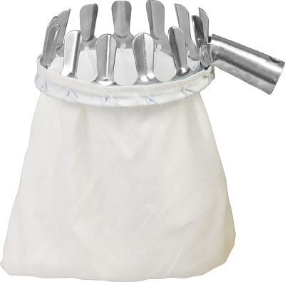 Плодосъемник предназначен для сбора фруктов с высоко расположенных ве- ток плодовых деревьев и представляет собой раму в виде кольца диаметром 110 мм из оцинкованной стали, на котором имеется 13 острых, расположенных по окружности резаков для срезки плодоножек. На раме имеется тулейка диаме- тром 20 мм для использования удлиняющей штанги или черенка. Снизу на раме закреплена х/б-корзина, не позволяющая плоду упасть на землю. Она легко чистится и стирается.