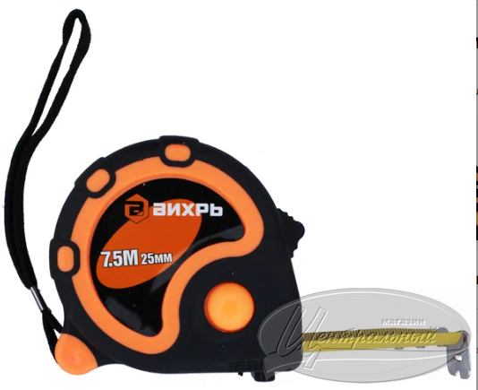 Рулетка вихрь 7,5м х 25мм используется для измерения расстояний и размеров различных объектов. Она состоит из металлической ленты длиной 7,5 м и шириной 25 мм, которая закреплена внутри пластикового корпуса с кнопкой блокировки. Лента имеет полимерное покрытие, защищающее от коррозии. Цена деления – 1 мм. Корпус двухкомпонентный: ударопрочный пластик и резиновое покрытие, которое не дает скользить в руке. Рулетка имеет 3 механизма фиксации ленты для удобства использования.