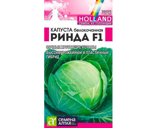 Капуста Ринда F1 – среднеспелый гибрид, предназначенный для переработки, употребления в свежем виде и недлительного хранения. Вкус отличный как в свежем, так и в квашеном виде. Кочан крупный, весом до 8 килограмм, округлый, хрустящий, хорошей плотности и вкусовых характеристик. Сорт устойчив к болезням и растрескиванию. Высевают на рассаду во второй части марта. К посадке рассада готова через 35-40 суток. Нуждается в закаливании и подкормке (первый раз в фазе двух настоящих листьев, второй — за пару дней до посадки). Высадка в конце апреля по схеме 35х50 сантиметров. Далее необходим полив, окучивание, прополка и рыхление. Во время вегетации проводят две подкормки (через 10 дней после посадки, затем через 10 дней). Для профилактики тли, улиток и слизней опудривают древесной золой из расхода 1 стакан на 1 квадратный метр.