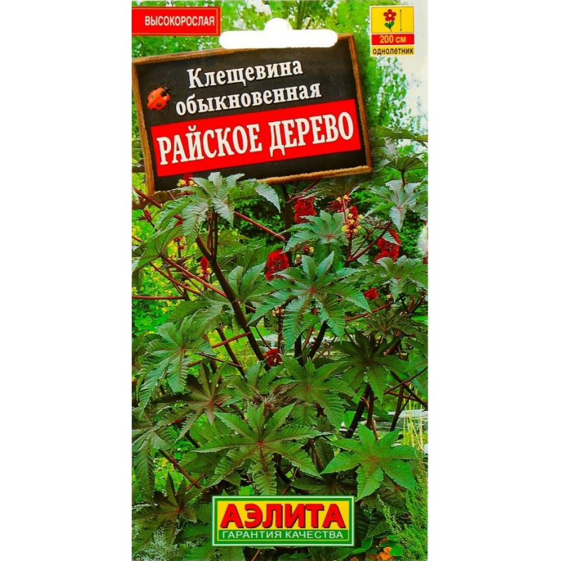 Клещевина Райское дерево — Однолетник. Высота 200 см. Быстрорастущий декоративно-лиственный однолетник. Красавица-африканка требует больших пространств для полноценного развития. Растение мощное, при хороших условиях достигает двух метров в высоту и примерно столько же в ширину. Эффектная орнаментальная листва придает клещевине «пальмовый» облик, совершенно экзотический для средней полосы. Самое подходящее место для нее – центр большой клумбы, живая изгородь по периметру участка или крупный вазон. Все части растения ядовиты для человека и животных. При работе с растением необходимо соблюдать меры предосторожности. Не употреблять в пищу! Растение тепло- и светолюбивое. Семена замачивают в воде в течение суток и сеют в отдельные горшочки. Высаживайте рассаду в заранее подготовленную посадочную яму, заполненную хорошим компостом, так как клещевина требует богатых, глубоко обработанных почв.