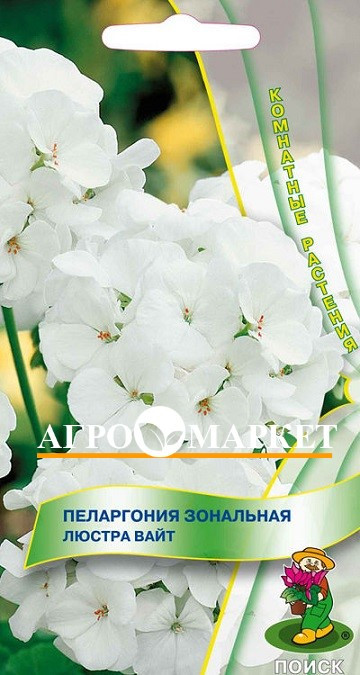 Пеларгония зональная Люстра Вайт. Поиск. Великолепная компактная форма. Растение высотой около 35 см. Листья округлые, с темным пятном в форме подковы. Цветы диаметром до 2,5 см, белые. Прекрасно подходит для горшечной культуры, летом можно высаживать в открытый грунт и балконные ящики. Растение засухоустойчивое, предпочитает солнечные месторасположение и рыхлые плодородные почвогрунты. Посевы можно проводить начиная с января. Глубина заделки семян 0,5 см. Посадочную емкость накрывают стеклом и ставят в освещенное место. При температуре почвы +20˚C всходы появляются на 15-20 день. В фазе 2-3 настоящих листочков сеянцы пикируют. Для лучшего кущения рассаду прищипывают над 5-6 листом. Семена соответствуют требованиям международных стандартов и ГОСТу РФ 12420-81
