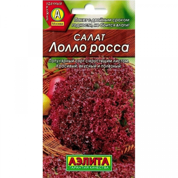 Салат Лолло Росса листовой — Популярный листовой сорт с отличными вкусовыми и декоративными качествами. Среднеспелый, от всходов до полного развития розетки 40-50 дней. Розетки высотой около 20 см, массой до 500 г. Листья хрустящие, нежные, сильно гофрированные по краю. Урожайность 3-3,2 кг/м2. Сорт устойчив к цветушности. Чтобы получать урожай в непрерывном режиме, семена высевают несколько раз за сезон с интервалом 10-15 дней.
