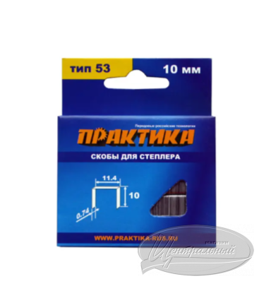 Скобы для степлера Практика, серия Мастер, 10 мм, тип 53 — поставляются блоком в количестве 1000 штук. Являются универсальным крепежном средством при выполнении следующих работ: натягивание обивочной ткани, прикрепление листов ДВП к дереву, крепление проволочных сеток, прибивание полиэтилена, картона и т.д. 53 тип скоб указывает на то, что их можно использовать в большинстве степлеров и скобозабивных пистолетах.