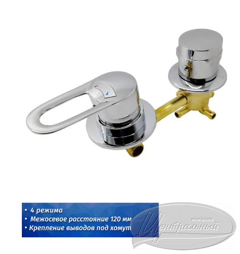 Корпус Латунь. Межосевое расстояние 120 мм, крепление выводов под ХОМУТ. Ручка смешивания воды металлическая.