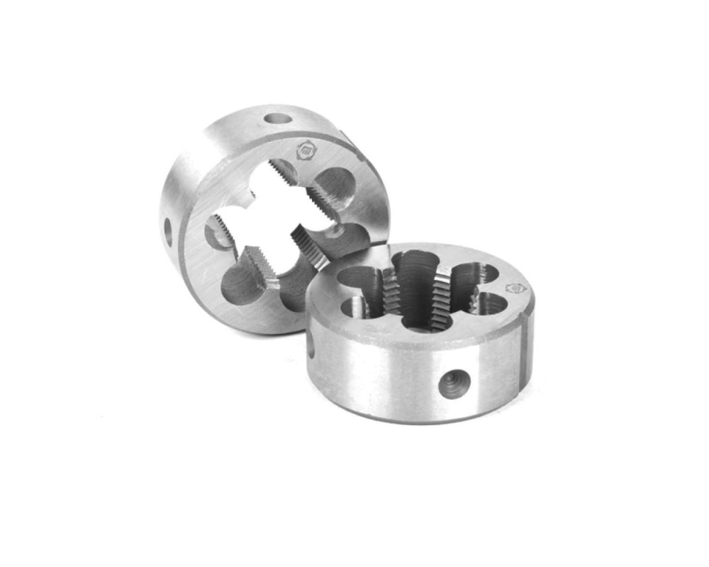Внутри плашки имеется расположенноепо центру большое отверстие с резьбой, образующей режущие грани, и от 3 до 6ровных отверстий поменьше, предназначенных для отвода стружки. Углубления ввиде конуса и паз на внешней стороне плашки служат для крепления лерки врезьбонарезном патроне или в воротке винтами. Оси нижних отверстий совпадают сосевыми плоскостями плашки, а оси верхних смещены для регулирования размера.Средняя толщина плашки – 7-8 витков, длина заборной части всего 2-3 витка.Материал, используемый для изготовления инструмента – твердые сплавы и сталь: быстрорежущая и легированная.