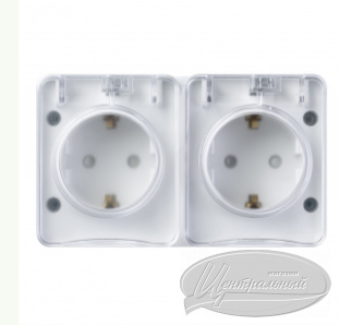 Моноблок из двух влагозащищенных розеток с заземлением и защитными шторками накладного исполнения белого цвета с прозрачной крышкой, 230 Вольт 16А, AtlasDesign Profi54.